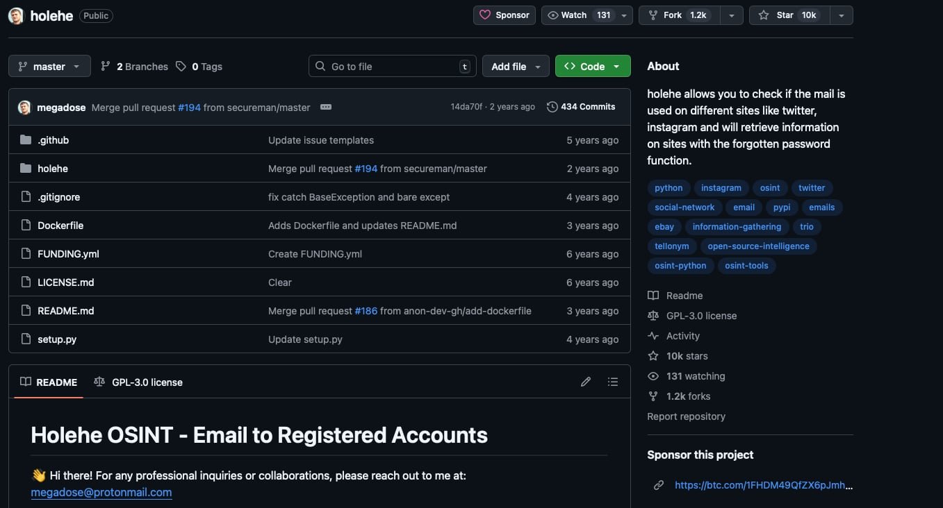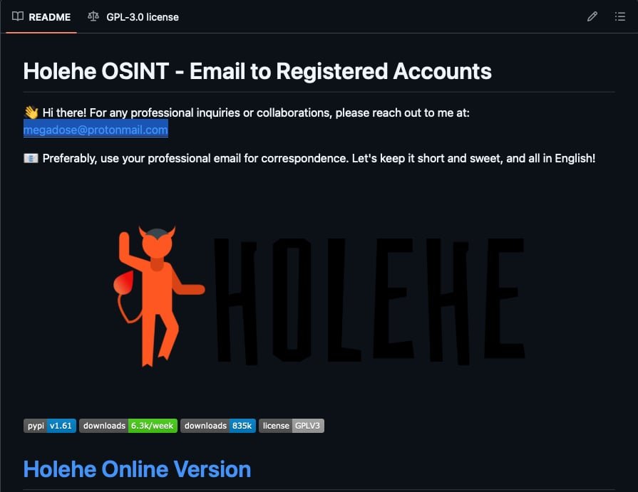 • Holehe is an open-source OSINT tool, likely hosted on a public code repository
